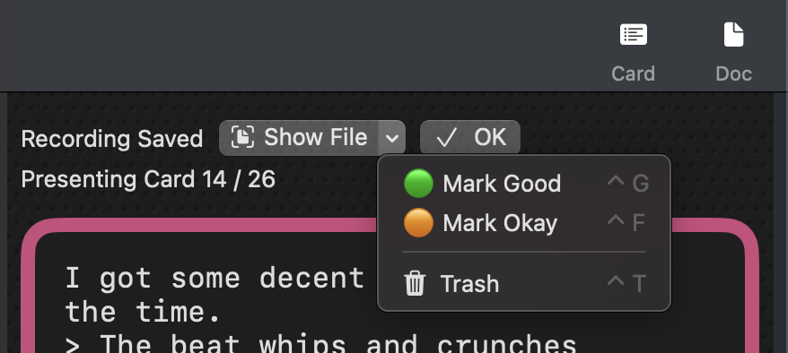 When your recording is complete, you can press “Show File”, or mark the take as “Good” or “Okay”.