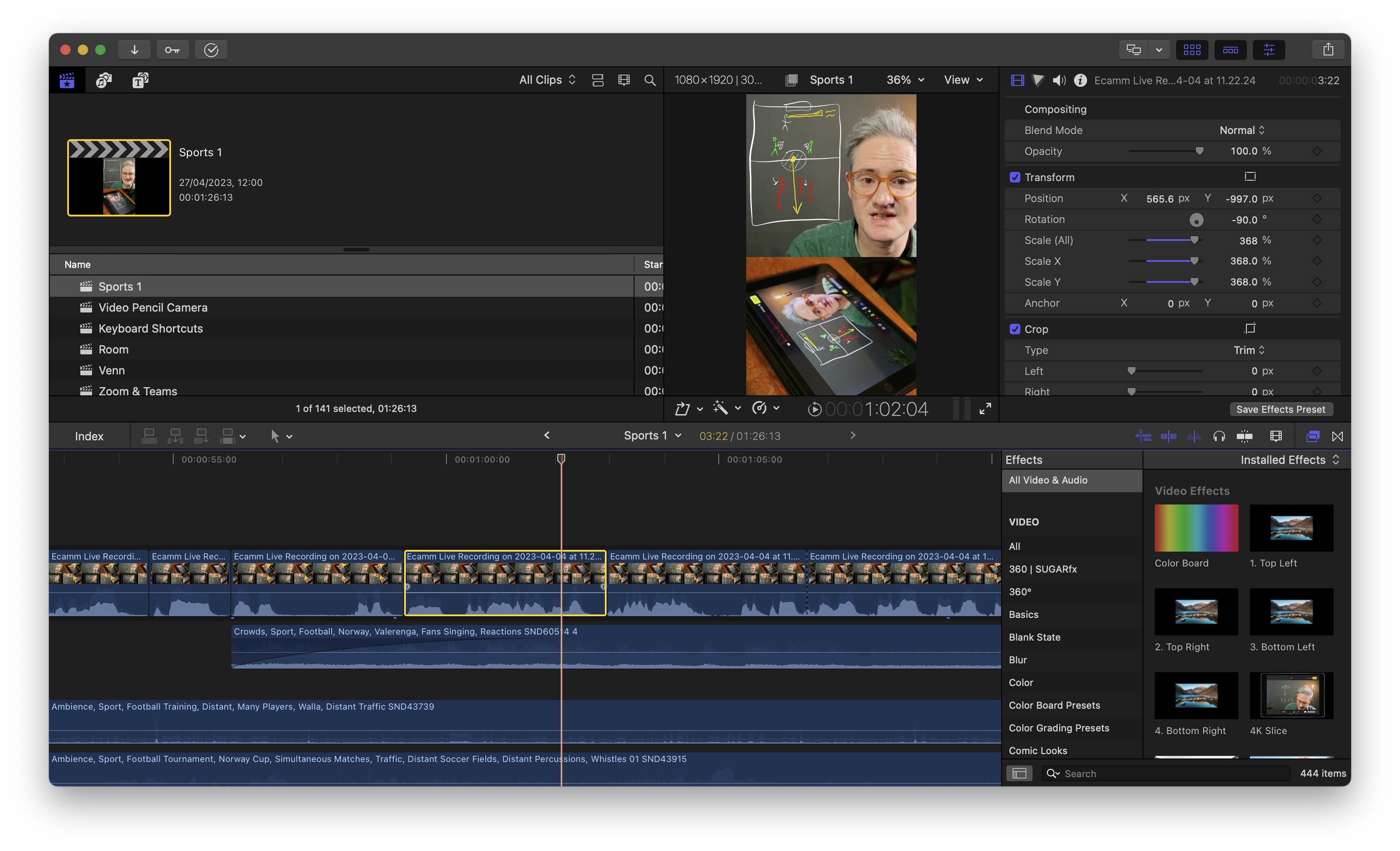 We recorded for an hour, trying out lots of different ideas and then I brought it into Final Cut for editing. I created Effect presets for the different crops to speed things up.